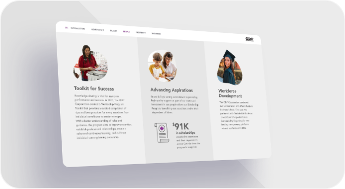 Workforce Development The ODP Corporation continued our collaboration with Miami Herbert Business School. This year, we partnered with Sustainable Business students who helped enhance Sustainability Reporting for two leading transparency platforms related to climate and ESG. Advancing Aspirations Grand & Toy’s strong commitment to providing high-quality support as part of our continued investment in our people drives our Scholarship Program, benefiting our associates and/or their dependent children. $ 91K in scholarships awarded to associates and their dependents across Canada since the program’s inception Toolkit for Success Knowledge sharing is vital for associate performance and success. In 2021, The ODP Corporation created a Mentorship Program Toolkit that provides a curated compilation of tips and best practices for every associate, from individual contributor to senior manager. With a better understanding of roles and guidance, the program aims to improve retention, establish professional relationships, create a culture of continuous learning, and cultivate individual career planning ownership. 28. INTRODUCTION GOVERNANCE PLANET PEOPLE PROSPERITY SASB INDEX 28. INTRODUCTION GOVERNANCE PLANET PEOPLE PROSPERITY SASB INDEX