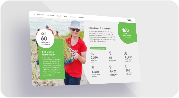 Drawdown Ecochallenge As part of our Earth Month activities, Office Depot participated in the Drawdown Ecochallenge — an engagement program that focuses on the collective impact of our individual actions to reduce emissions. With 160 participants and 46,971 points, Office Depot took 4 th place in the competition. 16 0 volunteers participated in the challenge 9,452 minutes spent learning 5,435 minutes spent outdoors 900 vegan meals consumed Sea Dunes Restoration Continuing our tradition, volunteers participated to help restore our Southern Florida coastline by planting sea oats. A native species, sea oats help stabilize and build dunes, and can be used to strengthen and protect existing dunes from erosion or help restore dunes damaged by storms. 14. INTRODUCTION GOVERNANCE PLANET PEOPLE PROSPERITY SASB INDEX 14. INTRODUCTION GOVERNANCE PLANET PEOPLE PROSPERITY SASB INDEX 3,219 lbs. of CO 2 saved 49 public officials contacted 13,730 minutes spent being mindful OUR COLLECTIVE IMPACT 60 volunteers planted sea oats