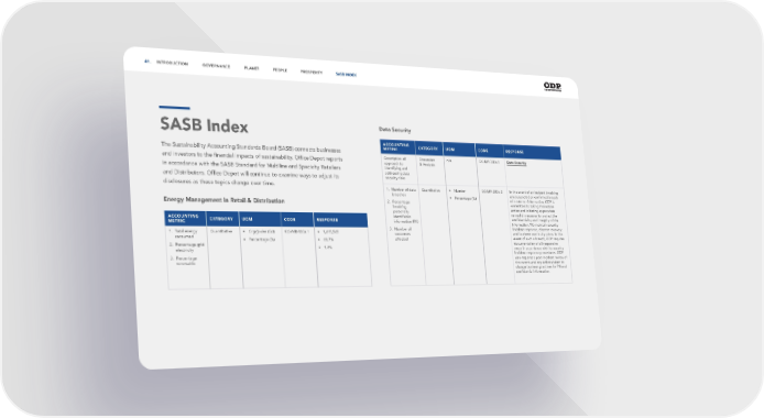 SASB Index The Sustainability Accounting Standards Board (SASB) connects businesses and investors to the financial impacts of sustainability. Office Depot reports in accordance with the SASB Standard for Multiline and Specialty Retailers and Distributors. Office Depot will continue to examine ways to adjust its disclosures as these topics change over time. ACCOUNTING METRIC CATEGORY UOM CODE RESPONSE 1. Total energy consumed 2. Percentage grid electricity 3. Percentage renewable Quantitative • Gigajoules (GJ) • Percentage (%) CG-MR-130a.1 • 1,615,565 • 63,7% • 1.4% Energy Management in Retail & Distribution ACCOUNTING METRIC CATEGORY UOM CODE RESPONSE Description of approach to identifying and addressing data security risks Discussion & Analysis n/a CG-MR-230a.1 Data Security 1. Number of data breaches 2. Percentage involving personally identifiable information (PII) 3. Number of customers affected Quantitative • Number • Percentage (%) CG-MR-230a.2 In the event of an incident involving any suspected or confirmed breach of customer information, ODP is committed to taking immediate action and initiating appropriate remedial measures to protect the confidentiality and integrity of the information. We maintain security incident response, disaster recovery and business continuity plans. In the event of such a breach, ODP requires documentation of all responsive steps in accordance with its security incident response procedures. ODP also requires a post-incident review of the events and any actions taken to change business practices for PII and confidential information. Data Security 41. INTRODUCTION GOVERNANCE PLANET PEOPLE PROSPERITY SASB INDEX
