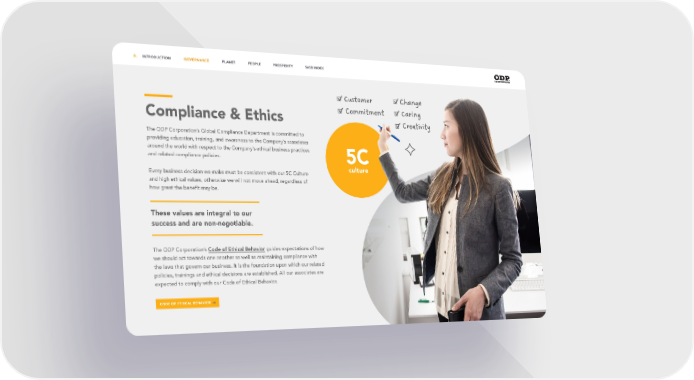 5C culture Compliance & Ethics The ODP Corporation’s Global Compliance Department is committed to providing education, training, and awareness to the Company’s associates around the world with respect to the Company’s ethical business practices and related compliance policies. Every business decision we make must be consistent with our 5C Culture and high ethical values, otherwise we will not move ahead, regardless of how great the benefit may be. These values are integral to our success and are non-negotiable. The ODP Corporation’s Code of Ethical Behavior guides expectations of how we should act towards one another as well as maintaining compliance with the laws that govern our business. It is the foundation upon which our related policies, trainings and ethical decisions are established. All our associates are expected to comply with our Code of Ethical Behavior. CODE OF ETHICAL BEHAVIOR 8. INTRODUCTION GOVERNANCE PLANET PEOPLE PROSPERITY SASB INDEX 8. INTRODUCTION GOVERNANCE PLANET PEOPLE PROSPERITY SASB INDEX