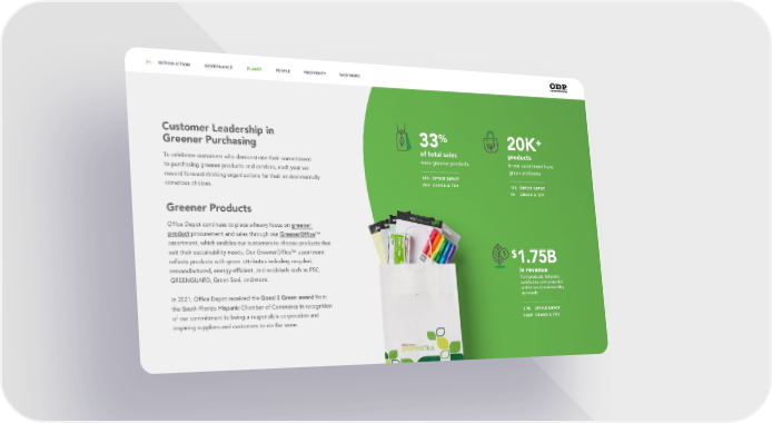 Customer Leadership in Greener Purchasing To celebrate customers who demonstrate their commitment to purchasing greener products and services, each year we reward forward-thinking organizations for their environmentally conscious choices. Greener Products Office Depot continues to place a heavy focus on greener product procurement and sales through our GreenerOffice â„¢ assortment, which enables our customers to choose products that suit their sustainability needs. Our GreenerOfficeâ„¢ assortment reflects products with green attributes including recycled, remanufactured, energy-efficient, and ecolabels such as FSC, GREENGUARD, Green Seal, and more. In 2021, Office Depot received the Good 2 Green award from the South Florida Hispanic Chamber of Commerce in recognition of our commitment to being a responsible corporation and inspiring suppliers and customers to do the same. 20K + products in our assortment have green attributes 15K OFFICE DEPOT 5K GRAND & TOY $ 1.75B in revenue from products 3rd-party certified to environmental and/or social sustainability standards 1.7B OFFICE DEPOT $46M GRAND & TOY 33 % of total sales were greener products 33% OFFICE DEPOT 28% GRAND & TOY 21. INTRODUCTION GOVERNANCE PLANET PEOPLE PROSPERITY SASB INDEX 21. INTRODUCTION GOVERNANCE PLANET PEOPLE PROSPERITY SASB INDEX