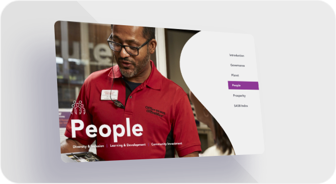 The Office Depot Sustainability Report Page 21 Page 23Diversity & Inclusion | Learning & Development | Community Investment People Introduction Governance Planet People Prosperity SASB Index