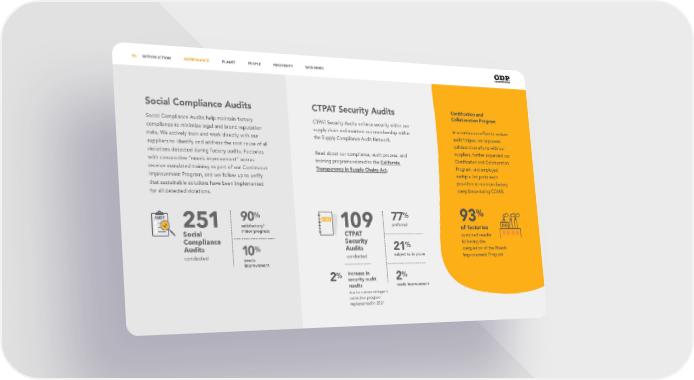 Social Compliance Audits Social Compliance Audits help maintain factory compliance to minimize legal and brand reputation risks. We actively train and work directly with our suppliers to identify and address the root cause of all violations detected during factory audits. Factories with consecutive “needs improvement” scores receive mandated training as part of our Continuous Improvement Program, and we follow up to verify that sustainable solutions have been implemented for all detected violations. 251 Social Compliance Audits conducted 90 % satisfactory/ minor progress 10 % needs improvement CTPAT Security Audits CTPAT Security Audits enforce security within our supply chain and maintain our membership within the Supply Compliance Audit Network. Read about our compliance, audit process, and training programs related to the California Transparency in Supply Chains Act. 109 CTPAT Security Audits conducted Certification and Collaboration Program In a continuous effort to reduce audit fatigue, we improved collaboration efforts with our suppliers, further expanded our Certification and Collaboration Program, and employed multiple 3rd party audit providers to maintain factory compliance during COVID. 93 % of factories sustained results following the completion of the Needs Improvement Program 77 % preferred 21 % subject to improve 2 % needs improvement 2 % increase in security audit results due to a more stringent corrective program implemented in 2021 10. INTRODUCTION GOVERNANCE PLANET PEOPLE PROSPERITY SASB INDEX 10. INTRODUCTION GOVERNANCE PLANET PEOPLE PROSPERITY SASB INDEX