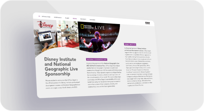 Disney Institute and National Geographic Live Sponsorship As presenting sponsor of the National Geographic Live 2021-22 North American Tour , Office Depot has helped enable National Geographic Explorers to reach local communities through over 169 live events in 50 cities across North America. These dynamic experiences helped further the knowledge of science, adventure and exploration of the natural wonders of our world. The sponsorship aligns seamlessly with Office Depot’s sustainability efforts and belief that caring for the environment plays an essential role in the success of their company, industry, and communities, now and for future generations. As the proud sponsor of Disney Institute professional development courses , Office Depot supports learning opportunities for individuals and organizations to experience Disney’s approach to high-quality training. Participants learn directly from Disney leaders to hone, inspire and enhance their skills in the areas of leadership excellence, quality service and employee engagement. Additionally, through this sponsorship, Office Depot provided complimentary online courses based on “Disney’s Foundation of Business Excellence” exclusively for Elevate Together ® grant recipients to help them leverage strategies to improve and grow their business. Participants were taught how to align their values and vision, create a culture by design, differentiate their service in the marketplace, and deliver on their organization’s Brand Promise. We are excited to announce that Office Depot is the official sponsor for Disney Institute professional development courses and National Geographic Live events on stages across North America in 2022. NATIONAL GEOGRAPHIC LIVE DISNEY INSTITUTE 29. INTRODUCTION GOVERNANCE PLANET PEOPLE PROSPERITY SASB INDEX 29. INTRODUCTION GOVERNANCE PLANET PEOPLE PROSPERITY SASB INDEX