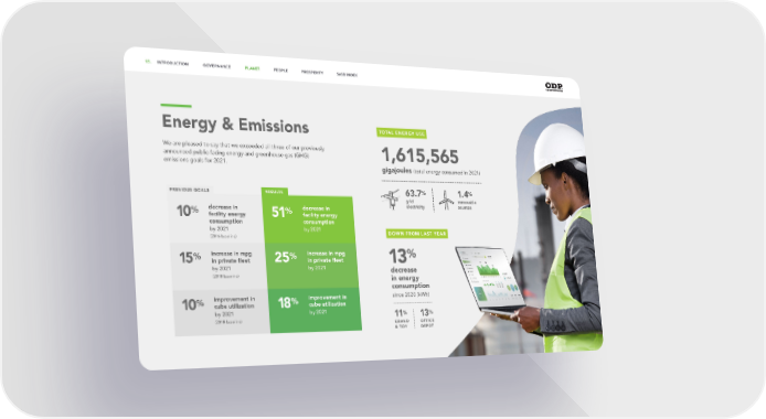 Energy & Emissions We are pleased to say that we exceeded all three of our previously announced public-facing energy and greenhouse gas (GHG) emissions goals for 2021. PREVIOUS GOALS RESULTS increase in mpg in private fleet by 2021 (2018 baseline) improvement in cube utilization by 2021 (2018 baseline) 15 % 10 % TOTAL ENERGY USE DOWN FROM LAST YEAR 13 % decrease in energy consumption since 2020 (kWh) 1,615,565 gigajoules (total energy consumed in 2021) 63.7 % grid electricity 1.4 % renewable sources 11 % GRAND & TOY 13 % OFFICE DEPOT 15. INTRODUCTION GOVERNANCE PLANET PEOPLE PROSPERITY SASB INDEX 15. INTRODUCTION GOVERNANCE PLANET PEOPLE PROSPERITY SASB INDEX decrease in facility energy consumption by 2021 (2016 baseline) 10 % decrease in facility energy consumption by 2021 51 % increase in mpg in private fleet by 2021 25 % improvement in cube utilization by 2021 18 %
