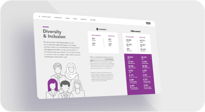 24. INTRODUCTION GOVERNANCE PLANET PEOPLE PROSPERITY SASB INDEX 24. INTRODUCTION GOVERNANCE PLANET PEOPLE PROSPERITY SASB INDEX MANAGEMENT ASSOCIATE 34 % Female 66 % Male 40 % Female 60 % Male 3 4 3 Grand & Toy Canada manages and maintains diversity metrics for equality in the workplace as per the Federal Contractors Program. The program requires Grand & Toy Canada to ensure that our workforce seeks to be representative of Canada’s labour force with respect to the members of the following four designated groups: women, people with disabilities, Aboriginal peoples, and visible minorities. Granular racial/ethnic group data cannot be tracked and are not mandatory by law. 4 The 2021 U.S. workforce data provided above is from the EEO-1 Reports for Office Depot, LLC and is based on employees’ voluntarily self-disclosure of gender and race/ ethnicity. The information does not include data from the Federation companies acquired by Office Depot, which continue to operate as separate entities. MANAGEMENT ASSOCIATE 34.80 % Female 65.20 % Male 00 % Non-binary 43.51 % Female 55.87 % Male 00.62 % Non-binary 66.04 % White 13.66 % Hispanic/Latinx 10.38 % African American 4.93 % Asian 2.17 % Two or more races 0.38 % American Indian or Alaska Native 0.49 % Native Hawaiian or Pacific Islander 50.74 % White 17.94 % Hispanic/Latinx 18.98 % African American 6.38 % Asian 2.39 % Two or more races 0.72 % American Indian or Alaska Native 0.96 % Native Hawaiian or Pacific Islander Diversity & Inclusion We are devoted to fostering an inclusive work environment that values and respects the culture, identities, talents, and contributions of associates from all backgrounds. In 2021, we focused our efforts on driving belonging, engagement, and retention through our programs and promoting a culture where everyone can bring their whole self to work.