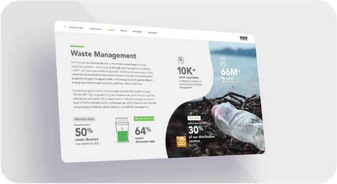 64 % waste diversion rate 66M + lbs. waste diverted from landfill 10 K + retail associates completed a training on Sustainability and Waste Management Waste Management One way we can substantially reduce the environmental impacts of our operations, products, and services is through waste management activities. In 2021, our newly created Waste Reduction Task Force drove company-wide awareness on sustainability and waste diversion initiatives, evaluated current programs for gaps and opportunities, and leveraged current partnerships to engage associates though education, activities, videos, and more. Our previous goal aimed to increase waste diverted from landfills to over 50% by 2021. We are proud to say we exceeded our landfill diversion goal by achieving an additional 14% in waste diversion! We are exploring innovative ways to further minimize waste and increase our landfill diversion rate through new packaging initiatives, plastic reduction, and effluent management. PREVIOUS GOAL WE ACHIEVED A 50 % waste diverted from landfills by 2021 Increase to over 17. INTRODUCTION GOVERNANCE PLANET PEOPLE PROSPERITY SASB INDEX 17. INTRODUCTION GOVERNANCE PLANET PEOPLE PROSPERITY SASB INDEX NEW GOAL 30 % of our distribution centers by 2025 Achieve zero waste in