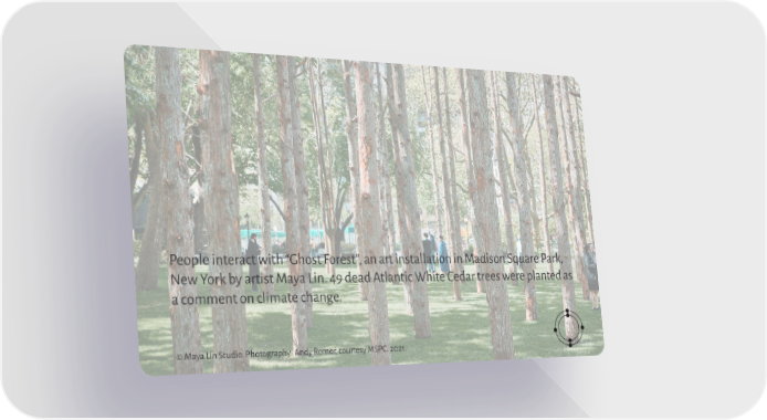People interact with “Ghost Forest”, an art installation in Madison Square Park, New York by artist Maya Lin. 49 dead Atlantic White Cedar trees were planted as a comment on climate change. © Maya Lin Studio. Photography: Andy Romer, courtesy MSPC. 2021.