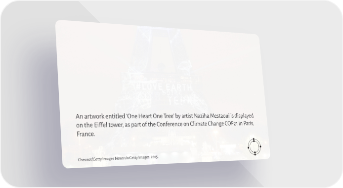 An artwork entitled ‘One Heart One Tree’ by artist Naziha Mestaoui is displayed on the Eiffel tower, as part of the Conference on Climate Change COP21 in Paris, France. Chesnot/Getty Images News via Getty Images. 2015.