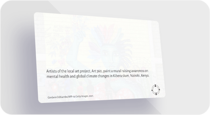 Artists of the local art project, Art 360, paint a mural raising awareness on mental health and global climate changes in Kibera slum, Nairobi, Kenya. Gordwin Odhiambo/AFP via Getty Images. 2021.