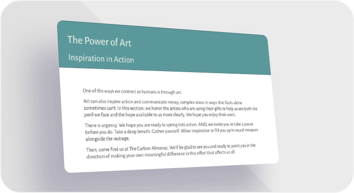 The Power of Art Inspiration in Action One of the ways we connect as humans is through art. Art can also inspire action and communicate messy, complex ideas in ways that facts alone sometimes can’t. In this section, we honor the artists who are using their gifts to help us see both the peril we face and the hope available to us more clearly. We hope you enjoy their work. There is urgency. We hope you are ready to spring into action. AND, we invite you to take a pause before you do. Take a deep breath. Gather yourself. Allow inspiration to fill you up in equal measure alongside the outrage. Then, come find us at The Carbon Almanac. We’ll be glad to see you and ready to point you in the direction of making your own meaningful difference in this effort that affects us all.