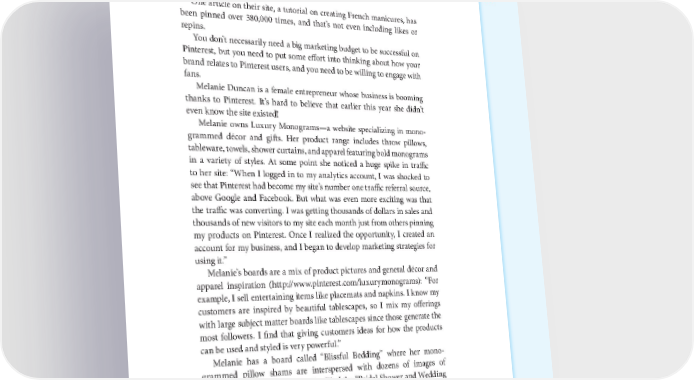THE POWER OF THE PLATFORM: VISUAL STORYTELLING ON SOCIAL NETWORKS 65 One article on their site, a tutorial on creating French manicures, has been pinned over 380,000 times, and that’s not even including likes or repins. You don’t necessarily need a big marketing budget to be successful on Pinterest, but you need to put some effort into thinking about how your brand relates to Pinterest users, and you need to be willing to engage with fans. Melanie Duncan is a female entrepreneur whose business is booming thanks to Pinterest. It’s hard to believe that earlier this year she didn’t even know the site existed! Melanie owns Luxury Monograms—a website specializing in mono- grammed décor and gifts. Her product range includes throw pillows, tableware, towels, shower curtains, and apparel featuring bold monograms in a variety of styles. At some point she noticed a huge spike in traffic to her site: “When I logged in to my analytics account, I was shocked to see that Pinterest had become my site’s number one traffic referral source, above Google and Facebook. But what was even more exciting was that the traffic was converting. I was getting thousands of dollars in sales and thousands of new visitors to my site each month just from others pinning my products on Pinterest. Once I realized the opportunity, I created an account for my business, and I began to develop marketing strategies for using it.” Melanie’s boards are a mix of product pictures and general décor and apparel inspiration (http://www.pinterest.com/luxurymonograms): “For example, I sell entertaining items like placemats and napkins. I know my customers are inspired by beautiful tablescapes, so I mix my offerings with large subject matter boards like tablescapes since those generate the most followers. I find that giving customers ideas for how the products can be used and styled is very powerful.” Melanie has a board called “Blissful Bedding” where her mono- grammed pillow shams are interspersed with dozens of images of beautiful beds and bedrooms. She filled the “Bridal Shower and Wedding Gift Ideas” board with products that complement her own items, and