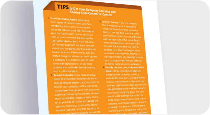168 THE POWER OF VISUAL STORYTELLING TIPS to Get Your Company Sourcing and Sharing User-Generated Content 1. Question sharing habits. Determine 3. Look for themes. If you’re a company what types of visual content your fans that already sees a lot of compelling are sharing about your company and images or videos from your social com- what the volume looks like. You need to munity, then pay close attention to the pass the “give a darn” factor with your most common types of photo and videos fans in order to collect the best-quality and hashtags used. What visual story is user-generated content. If it’s not natu- being told about your company? Is it in ral for your fans to share visual content line with the visual story you want to about your company, you’ll face a higher be told? How does the image or video barrier to entry. Alternatively, user-gen- sentiment skew—positive, negative, or erated images or videos can work against neutral? Use these key learnings to shape a company if its products do not meet your strategy around this user behavior consumer expectations, so pay close to form a more fan-centric campaign. attention to sentiment before jumping 4. Identify the pros, cons, and potential for into a UGC campaign. hijacks. When considering a user-gen- 2. Reward behavior. If you need an extra erated content campaign, carefully boost to encourage consumers to share evaluate the pros, cons, and potential for user-generated content, you may want to hijacks. The pros need to align with key launch your campaign with a contest to business objections and spell out how the try and seed the behavior with your core user-generated content will add value to audience. Following the contest, share as your visual storytelling goals. The cons many compelling images, videos, and so would relate to things like barriers to on as possible to further encourage the entry, negative sentiments, costs to your behavior from your community. Going company, and the potential to take your forward, sprinkle in further contests, or campaign in a direction that you don’t surprise-and-delight rewards as a way to want it to go in. Though not overly com- thank your loyal fans for participating. mon, UGC hijacks can happen. As a result,