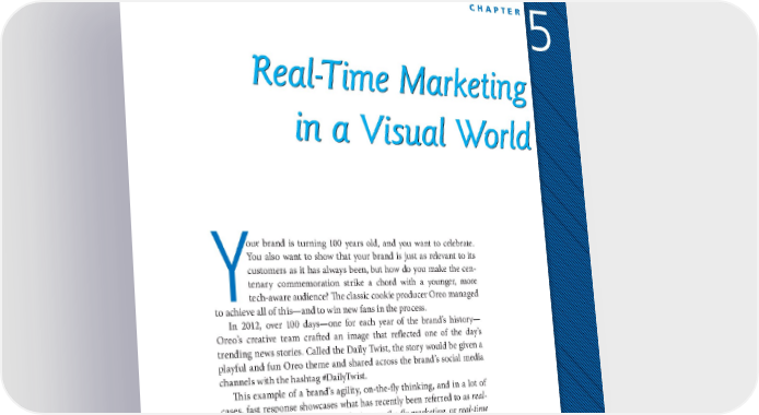 CHAPTER5 Real-Time Marketing in a Visual World our brand is turning 100 years old, and you want to celebrate. You also want to show that your brand is just as relevant to its customers as it has always been, but how do you make the cen- tenary commemoration strike a chord with a younger, more Ytech-aware audience? The classic cookie producer Oreo managed to achieve all of this—and to win new fans in the process. In 2012, over 100 days—one for each year of the brand’s history— Oreo’s creative team crafted an image that reflected one of the day’s trending news stories. Called the Daily Twist, the story would be given a playful and fun Oreo theme and shared across the brand’s social media channels with the hashtag #DailyTwist. This example of a brand’s agility, on-the-fly thinking, and in a lot of cases, fast response showcases what has recently been referred to as real- time marketing (RTM), agile marketing, on-the-y marketing, or real-time social response. Oreo listened to what was important to its audience, and 177