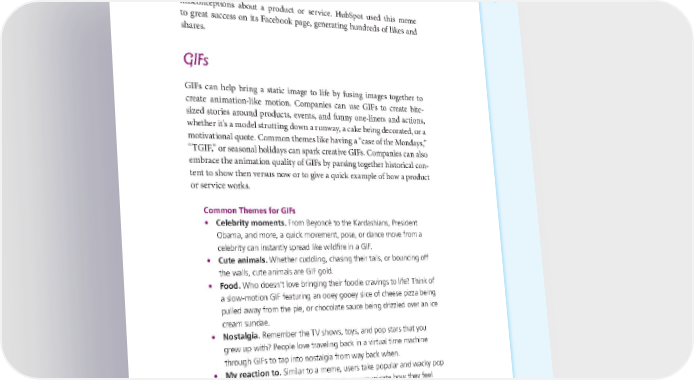 DEVELOPING A VISUAL STORYTELLING ROAD MAP: FROM STRATEGY TO IMPLEMENTATION 163 misconceptions about a product or service. HubSpot used this meme to great success on its Facebook page, generating hundreds of likes and shares. GIFs GIFs can help bring a static image to life by fusing images together to create animation-like motion. Companies can use GIFs to create bite- sized stories around products, events, and funny one-liners and actions, whether it’s a model strutting down a runway, a cake being decorated, or a motivational quote. Common themes like having a “case of the Mondays,” “TGIF,” or seasonal holidays can spark creative GIFs. Companies can also embrace the animation quality of GIFs by parsing together historical con- tent to show then versus now or to give a quick example of how a product or service works. Common Themes for GIFs • Celebrity moments. From Beyoncé to the Kardashians, President Obama, and more, a quick movement, pose, or dance move from a celebrity can instantly spread like wildfire in a GIF. • Cute animals. Whether cuddling, chasing their tails, or bouncing off the walls, cute animals are GIF gold. • Food. Who doesn’t love bringing their foodie cravings to life? Think of a slow-motion GIF featuring an ooey gooey slice of cheese pizza being pulled away from the pie, or chocolate sauce being drizzled over an ice cream sundae. • Nostalgia. Remember the TV shows, toys, and pop stars that you grew up with? People love traveling back in a virtual time machine through GIFs to tap into nostalgia from way back when. • My reaction to. Similar to a meme, users take popular and wacky pop culture reactions GIFs and use them to communicate how they feel about events in their lives. If they’re upset, they may show a celebrity