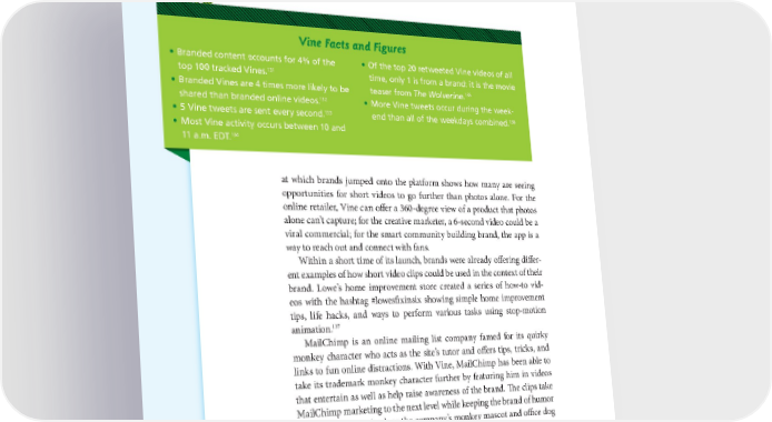 108 THE POWER OF VISUAL STORYTELLING Vine Facts and Figures • Branded content accounts for 4% of the • Of the top 20 retweeted Vine videos of all 131 top 100 tracked Vines. time, only 1 is from a brand: it is the movie • Branded Vines are 4 times more likely to be 135 teaser from The Wolverine. 132 • More Vine tweets occur during the week- shared than branded online videos. 133 136 • 5 Vine tweets are sent every second. end than all of the weekdays combined. • Most Vine activity occurs between 10 and 11 a.m. EDT.134 at which brands jumped onto the platform shows how many are seeing opportunities for short videos to go further than photos alone. For the online retailer, Vine can offer a 360-degree view of a product that photos alone can’t capture; for the creative marketer, a 6-second video could be a viral commercial; for the smart community building brand, the app is a way to reach out and connect with fans. Within a short time of its launch, brands were already offering differ- ent examples of how short video clips could be used in the context of their brand. Lowe’s home improvement store created a series of how-to vid- eos with the hashtag #lowesfixinsix showing simple home improvement tips, life hacks, and ways to perform various tasks using stop-motion 137 animation. MailChimp is an online mailing list company famed for its quirky monkey character who acts as the site’s tutor and offers tips, tricks, and links to fun online distractions. With Vine, MailChimp has been able to take its trademark monkey character further by featuring him in videos that entertain as well as help raise awareness of the brand. The clips take MailChimp marketing to the next level while keeping the brand of humor and online memes (such as the company’s monkey mascot and office dog 138 Maddie standing on things) that their fans love and recognize.