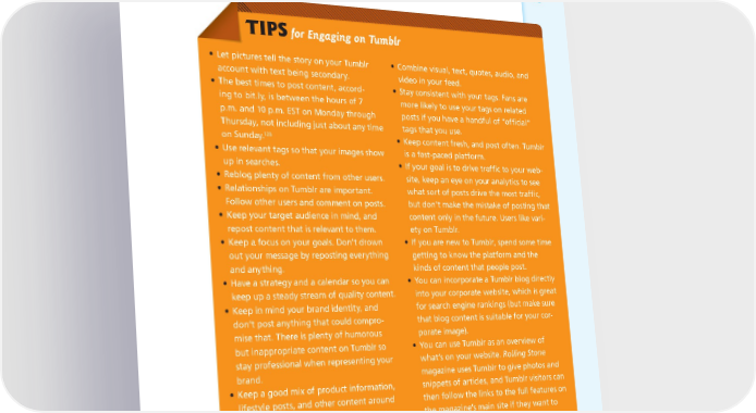 THE POWER OF THE PLATFORM: VISUAL STORYTELLING ON SOCIAL NETWORKS 105 TIPS for Engaging on Tumblr • Let pictures tell the story on your Tumblr • Combine visual, text, quotes, audio, and account with text being secondary. video in your feed. • The best times to post content, accord- • Stay consistent with your tags. Fans are ing to bit.ly, is between the hours of 7 more likely to use your tags on related p.m. and 10 p.m. EST on Monday through posts if you have a handful of “official” Thursday, not including just about any time tags that you use. 126 on Sunday. • Keep content fresh, and post often. Tumblr • Use relevant tags so that your images show is a fast-paced platform. up in searches. • If your goal is to drive traffic to your web- • Reblog plenty of content from other users. site, keep an eye on your analytics to see • Relationships on Tumblr are important. what sort of posts drive the most traffic, Follow other users and comment on posts. but don’t make the mistake of posting that • Keep your target audience in mind, and content only in the future. Users like vari- repost content that is relevant to them. ety on Tumblr. • Keep a focus on your goals. Don’t drown • If you are new to Tumblr, spend some time out your message by reposting everything getting to know the platform and the and anything. kinds of content that people post. • Have a strategy and a calendar so you can • You can incorporate a Tumblr blog directly keep up a steady stream of quality content. into your corporate website, which is great • Keep in mind your brand identity, and for search engine rankings (but make sure don’t post anything that could compro- that blog content is suitable for your cor- mise that. There is plenty of humorous porate image). but inappropriate content on Tumblr so • You can use Tumblr as an overview of stay professional when representing your what’s on your website. Rolling Stone brand. magazine uses Tumblr to give photos and • Keep a good mix of product information, snippets of articles, and Tumblr visitors can lifestyle posts, and other content around then follow the links to the full features on your brand so your feed doesn’t appear the magazine’s main site if they want to too overly commercial. learn more.