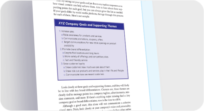 DEVELOPING A VISUAL STORYTELLING ROAD MAP: FROM STRATEGY TO IMPLEMENTATION 137 Start by listing out your goals and jot down very topline responses as to how visual content can help achieve them. Aim to have about three sup- porting points for each goal, but you can always grow the list as needed. If your goals differ by social media platform, then go through this process for each of them. Here’s our sample: XYZ Company Goals and Supporting Themes 1. Increase sales a. Raise awareness for products and services b. Communicate promotions, coupons, offers c. Target communications for new store openings or product availability 2. Promote brand differentiation a. Easy-to-find locations and long hours b. More variety of offerings and competitive prices c. Fast and friendly service 3. Grow customer loyalty a. Show customers how much we care about them b. Show role our products and services play in their life and lifestyle c. Communicate how we reward customers Look closely at these goals and supporting themes, and they will likely be in line with key brand differentiators. Chances are, these themes are closely tied to message points in a company tagline, advertisements, mis- sion statement, and more. If there’s anything major missing that’s a key company goal or brand differentiator, now is the time to add it. Although a good start, this alone will not communicate a cohesive visual story. Next, look closely at your company’s voice and personality. Social media platforms all require a more human touch than other online communications. This offers a good opportunity for your company’s voice