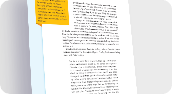 16 THE POWER OF VISUAL STORYTELLING Visuals are processed 60,000 times specific moods, things that are almost impossible to con- faster than text by the human vey using words. Do you think that if 100 people heard brain and 90% of information the word “girl,” they would all think of the same thing, 17 transmitted to the brain is visual. exactly? Would they all feel the same thing? But looking at Humans evolved over millennia to a picture like the one on the previous page, the majority of respond to visual information long people will think and feel something very similar. before they developed the ability to Images act like shortcuts to the brain: we are visual read text. creatures, and we are programmed to react to visuals more than to words. In the 1960s, Professor Albert Mehrabian 18 showed that 93% of communication is in fact nonverbal. By this he meant that most of the feelings and attitudes of a message come from the facial expressions and the way the words are said, and the rest, only 7%, derives from the actual words being spoken. It isn’t even just the meanings of a message that are conveyed more precisely by visual infor- mation. Even issues of trust and credibility are carried by images far more so than text. Dan Roam, an expert on visual storytelling and an author of the inter- national bestseller The Back of the Napkin: Solving Problems and Selling Ideas with Pictures, says: We live in a world that is very noisy. There are a lot of conver- sations and buzzwords around us. The number one way out of this noise is just to become visual. To show things with pictures. For thousands of years people have been drawing. If you think about the history of communication from then till now, it goes through all the different periods of time where people are try- ing to find ways to share information with each other. For the longest time, it was through telling stories around the campfire, reciting poems, and singing songs. That was the technology that was available. All along, all we wanted to do was share pictures with each other. Painting was the only way to convey a message visually. Then came writing and the printing press. Now let’s