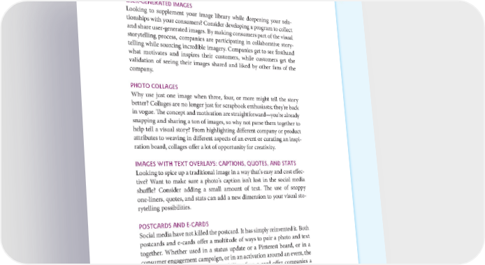 TYPES, TIPS, AND TACTICS OF VISUAL MARKETING 27 USER-GENERATED IMAGES Looking to supplement your image library while deepening your rela- tionships with your consumers? Consider developing a program to collect and share user-generated images. By making consumers part of the visual storytelling process, companies are participating in collaborative story- telling while sourcing incredible imagery. Companies get to see firsthand what motivates and inspires their customers, while customers get the validation of seeing their images shared and liked by other fans of the company. PHOTO COLLAGES Why use just one image when three, four, or more might tell the story better? Collages are no longer just for scrapbook enthusiasts; they’re back in vogue. The concept and motivation are straightforward—you’re already snapping and sharing a ton of images, so why not parse them together to help tell a visual story? From highlighting different company or product attributes to weaving in different aspects of an event or curating an inspi- ration board, collages offer a lot of opportunity for creativity. IMAGES WITH TEXT OVERLAYS: CAPTIONS, QUOTES, AND STATS Looking to spice up a traditional image in a way that’s easy and cost effec- tive? Want to make sure a photo’s caption isn’t lost in the social media shuffle? Consider adding a small amount of text. The use of snappy one-liners, quotes, and stats can add a new dimension to your visual sto- rytelling possibilities. POSTCARDS AND E-CARDS Social media have not killed the postcard. It has simply reinvented it. Both postcards and e-cards offer a multitude of ways to pair a photo and text together. Whether used in a status update or a Pinterest board, or in a consumer engagement campaign, or in an activation around an event, the nostalgia, convenience, and shareability of an e-card offer companies a unique visual storytelling opportunity.