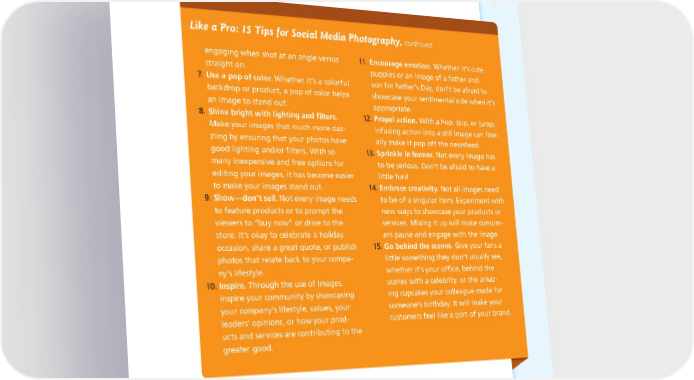 DEVELOPING A VISUAL STORYTELLING ROAD MAP: FROM STRATEGY TO IMPLEMENTATION 149 Like a Pro: 15 Tips for Social Media Photography, continued engaging when shot at an angle versus 11. Encourage emotion. Whether it’s cute straight on. puppies or an image of a father and 7. Use a pop of color. Whether it’s a colorful son for Father’s Day, don’t be afraid to backdrop or product, a pop of color helps showcase your sentimental side when it’s an image to stand out. appropriate. 8. Shine bright with lighting and filters. 12. Propel action. With a hop, skip, or jump, Make your images that much more daz- infusing action into a still image can liter- zling by ensuring that your photos have ally make it pop off the newsfeed. good lighting and/or filters. With so 13. Sprinkle in humor. Not every image has many inexpensive and free options for to be serious. Don’t be afraid to have a editing your images, it has become easier little fun! to make your images stand out. 14. Embrace creativity. Not all images need 9. Show—dont sell. Not every image needs to be of a singular item. Experiment with to feature products or to prompt the new ways to showcase your products or viewers to “buy now” or drive to the services. Mixing it up will make consum- store. It’s okay to celebrate a holiday ers pause and engage with the image. occasion, share a great quote, or publish 15. Go behind the scenes. Give your fans a photos that relate back to your compa- little something they don’t usually see, ny’s lifestyle. whether it’s your office, behind the 10. Inspire. Through the use of images, scenes with a celebrity, or the amaz- inspire your community by showcasing ing cupcakes your colleague made for your company’s lifestyle, values, your someone’s birthday. It will make your leaders’ opinions, or how your prod- customers feel like a part of your brand. ucts and services are contributing to the greater good.