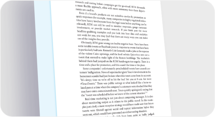 192 THE POWER OF VISUAL STORYTELLING research and testing before campaigns get the go-ahead. RTM demands a more flexible approach, often with more autonomy than these depart- ments are used to. Even if a brand’s products are not suited to on-the-fly promotion or quick responses (for example, many companies in highly regulated indus- tries have heavy involvement from the legal team before anything can be released), RTM can still be used to monitor responses, gauge customer involvement, or provide market research. If you think past the more headline-grabbing examples and you look into how data and analytics can work for you, you may find that there are many ways you can make use of the insights they provide. Obviously, RTM gone wrong can lead to negative buzz. There have been some notable tweets or Facebook posts in response to events that have been in particularly bad taste. Kenneth Cole famously made a joke at the expense of the violent Cairo uprisings, and the food website Epicurious sent out a tweet that seemed to make light of the Boston bombings. The marketers behind them had jumped on the RTM bandwagon too eagerly. There is a time and a place for promotion, and this wasn’t the time or the place. Some companies’ unfortunately prescheduled tweets have caused cus- tomers’ indignation. News of supermarket giant Tesco’s involvement in the horsemeat scandal had just broken when this tweet came from its account: “It’s sleepy time so we’re off to hit the hay! See you at 8 a.m. for more #TescoTweets.” There was public outrage at what looked like a horse-re- lated pun at a time when the company’s customers were shocked that they may have eaten contaminated meat. Tesco quickly apologized, saying that 17 the “tweet was scheduled before we knew of the current situation.” Real-time marketing is not just about composing messages. It is also about monitoring output as it relates to the public mood. In the exam- ples just cited, a more receptive strategy would have made sure that future tweets were filtered against social and topical information before they went out, which would have prevented an embarrassing situation. Not all RTM social media fails have been quite so badly judged. Sometimes coming across as unoriginal or tacky can be detrimental to a