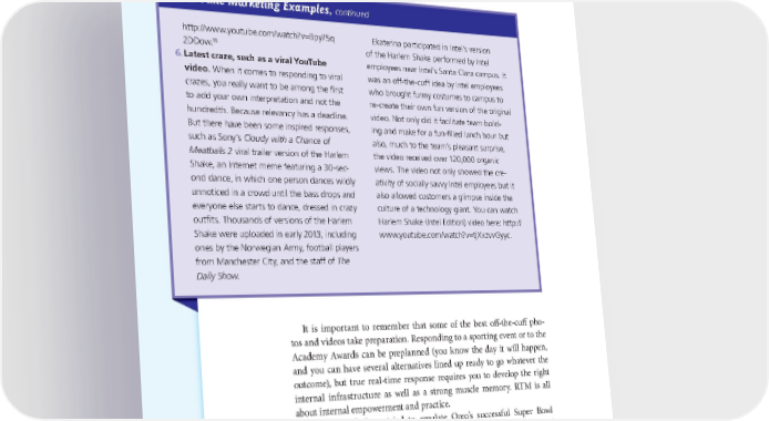 190 THE POWER OF VISUAL STORYTELLING Real-Time Marketing Examples, continued http://www.youtube.com/watch?v=Bpy75q Ekaterina participated in Intel’s version 16 2DDow. of the Harlem Shake performed by Intel 6. Latest craze, such as a viral YouTube employees near Intel’s Santa Clara campus. It video. When it comes to responding to viral was an off-the-cuff idea by Intel employees crazes, you really want to be among the first who brought funny costumes to campus to to add your own interpretation and not the re-create their own fun version of the original hundredth. Because relevancy has a deadline. video. Not only did it facilitate team build- But there have been some inspired responses, ing and make for a fun-filled lunch hour but such as Sony’s Cloudy with a Chance of also, much to the team’s pleasant surprise, Meatballs 2 viral trailer version of the Harlem the video received over 120,000 organic Shake, an Internet meme featuring a 30-sec- views. The video not only showed the cre- ond dance, in which one person dances wildly ativity of socially savvy Intel employees but it unnoticed in a crowd until the bass drops and also allowed customers a glimpse inside the everyone else starts to dance, dressed in crazy culture of a technology giant. You can watch outfits. Thousands of versions of the Harlem Harlem Shake (Intel Edition) video here: http:// Shake were uploaded in early 2013, including www.youtube.com/watch?v=tjXxzvvGyyc. ones by the Norwegian Army, football players from Manchester City, and the staff of The Daily Show. It is important to remember that some of the best off-the-cuff pho- tos and videos take preparation. Responding to a sporting event or to the Academy Awards can be preplanned (you know the day it will happen, and you can have several alternatives lined up ready to go whatever the outcome), but true real-time response requires you to develop the right internal infrastructure as well as a strong muscle memory. RTM is all about internal empowerment and practice. Many brands have tried to emulate Oreo’s successful Super Bowl tweet, but it was no “happy accident” or lucky event that can be copied