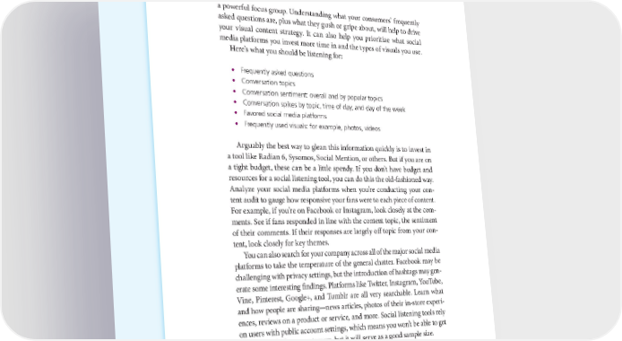 132 THE POWER OF VISUAL STORYTELLING a powerful focus group. Understanding what your consumers’ frequently asked questions are, plus what they gush or gripe about, will help to drive your visual content strategy. It can also help you prioritize what social media platforms you invest more time in and the types of visuals you use. Here’s what you should be listening for: • Frequently asked questions • Conversation topics • Conversation sentiment: overall and by popular topics • Conversation spikes by topic, time of day, and day of the week • Favored social media platforms • Frequently used visuals: for example, photos, videos Arguably the best way to glean this information quickly is to invest in a tool like Radian 6, Sysomos, Social Mention, or others. But if you are on a tight budget, these can be a little spendy. If you don’t have budget and resources for a social listening tool, you can do this the old-fashioned way. Analyze your social media platforms when you’re conducting your con- tent audit to gauge how responsive your fans were to each piece of content. For example, if you’re on Facebook or Instagram, look closely at the com- ments. See if fans responded in line with the content topic, the sentiment of their comments. If their responses are largely off topic from your con- tent, look closely for key themes. You can also search for your company across all of the major social media platforms to take the temperature of the general chatter. Facebook may be challenging with privacy settings, but the introduction of hashtags may gen- erate some interesting findings. Platforms like Twitter, Instagram, YouTube, Vine, Pinterest, Google+, and Tumblr are all very searchable. Learn what and how people are sharing—news articles, photos of their in-store experi- ences, reviews on a product or service, and more. Social listening tools rely on users with public account settings, which means you won’t be able to get data from all of your customers, but it will serve as a good sample size.