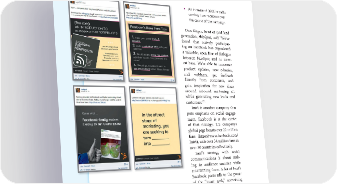 84 THE POWER OF VISUAL STORYTELLING • An increase of 39% in traffic coming from Facebook over the course of the campaign Dan Slagen, head of paid lead generation, HubSpot, said: “We’ve found that actively participat- ing on Facebook has engendered a valuable, open line of dialogue between HubSpot and its inter- est base. We’re able to announce product updates, new e-books, and webinars, get feedback directly from customers, and gain inspiration for new ideas around inbound marketing all while generating new leads and customers.”71 Intel is another company that puts emphasis on social engage- ment. Facebook is at the center of that strategy. The company’s global page boasts over 22 million fans (https://www.facebook.com/ Intel), with over 34 million fans in over 50 countries collectively. Intel’s strategy with social communications is about mak- ing its audience smarter while entertaining them. A lot of Intel’s Facebook posts talk to the power of the “inner geek,” something Intel’s audience strongly relates
