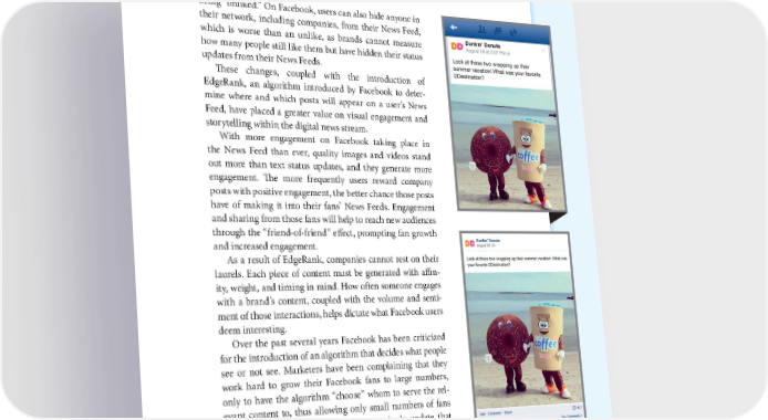 THE RISE OF VISUAL STORYTELLING 13 being “unliked.” On Facebook, users can also hide anyone in their network, including companies, from their News Feed, which is worse than an unlike, as brands cannot measure how many people still like them but have hidden their status updates from their News Feeds. These changes, coupled with the introduction of EdgeRank, an algorithm introduced by Facebook to deter- mine where and which posts will appear on a user’s News Feed, have placed a greater value on visual engagement and storytelling within the digital news stream. With more engagement on Facebook taking place in the News Feed than ever, quality images and videos stand out more than text status updates, and they generate more engagement. The more frequently users reward company posts with positive engagement, the better chance those posts have of making it into their fans’ News Feeds. Engagement and sharing from those fans will help to reach new audiences through the “friend-of-friend” effect, prompting fan growth and increased engagement. As a result of EdgeRank, companies cannot rest on their laurels. Each piece of content must be generated with affin- ity, weight, and timing in mind. How often someone engages with a brand’s content, coupled with the volume and senti- ment of those interactions, helps dictate what Facebook users deem interesting. Over the past several years Facebook has been criticized for the introduction of an algorithm that decides what people see or not see. Marketers have been complaining that they work hard to grow their Facebook fans to large numbers, only to have the algorithm “choose” whom to serve the rel- evant content to, thus allowing only small numbers of fans from the overall fan base to see every single update that brands post.