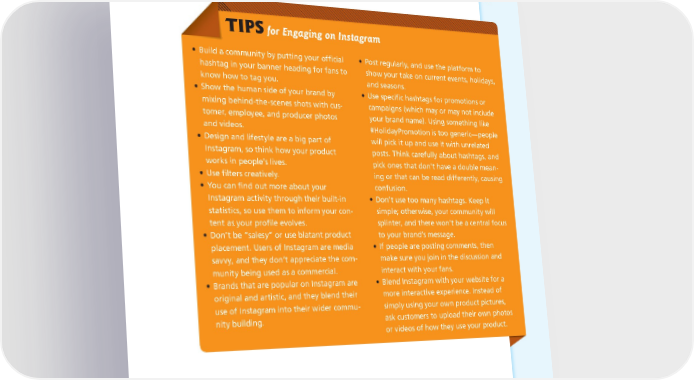 THE POWER OF THE PLATFORM: VISUAL STORYTELLING ON SOCIAL NETWORKS 97 TIPS for Engaging on Instagram • Build a community by putting your official • Post regularly, and use the platform to hashtag in your banner heading for fans to show your take on current events, holidays, know how to tag you. and seasons. • Show the human side of your brand by • Use specific hashtags for promotions or mixing behind-the-scenes shots with cus- campaigns (which may or may not include tomer, employee, and producer photos your brand name). Using something like and videos. #HolidayPromotion is too generic—people • Design and lifestyle are a big part of will pick it up and use it with unrelated Instagram, so think how your product posts. Think carefully about hashtags, and works in people’s lives. pick ones that don’t have a double mean- • Use filters creatively. ing or that can be read differently, causing • You can find out more about your confusion. Instagram activity through their built-in • Don’t use too many hashtags. Keep it statistics, so use them to inform your con- simple; otherwise, your community will tent as your profile evolves. splinter, and there won’t be a central focus • Don’t be “salesy” or use blatant product to your brand’s message. placement. Users of Instagram are media • If people are posting comments, then savvy, and they don’t appreciate the com- make sure you join in the discussion and munity being used as a commercial. interact with your fans. • Brands that are popular on Instagram are • Blend Instagram with your website for a original and artistic, and they blend their more interactive experience. Instead of use of Instagram into their wider commu- simply using your own product pictures, nity building. ask customers to upload their own photos or videos of how they use your product.