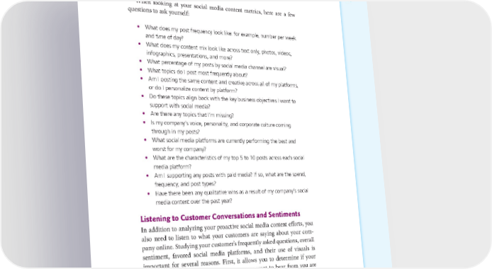 DEVELOPING A VISUAL STORYTELLING ROAD MAP: FROM STRATEGY TO IMPLEMENTATION 131 When looking at your social media content metrics, here are a few questions to ask yourself: • What does my post frequency look like: for example, number per week and time of day? • What does my content mix look like across text only, photos, videos, infographics, presentations, and more? • What percentage of my posts by social media channel are visual? • What topics do I post most frequently about? • Am I posting the same content and creative across all of my platforms, or do I personalize content by platform? • Do these topics align back with the key business objectives I want to support with social media? • Are there any topics that I’m missing? • Is my company’s voice, personality, and corporate culture coming through in my posts? • What social media platforms are currently performing the best and worst for my company? • What are the characteristics of my top 5 to 10 posts across each social media platform? • Am I supporting any posts with paid media? If so, what are the spend, frequency, and post types? • Have there been any qualitative wins as a result of my company’s social media content over the past year? Listening to Customer Conversations and Sentiments In addition to analyzing your proactive social media content efforts, you also need to listen to what your customers are saying about your com- pany online. Studying your customer’s frequently asked questions, overall sentiment, favored social media platforms, and their use of visuals is important for several reasons. First, it allows you to determine if your proactive content and what your consumers want to hear from you are in alignment. Second, social media conversation about your company is
