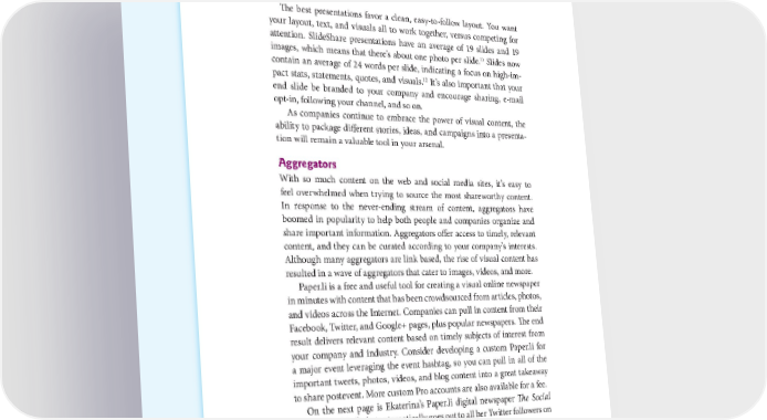 40 THE POWER OF VISUAL STORYTELLING The best presentations favor a clean, easy-to-follow layout. You want your layout, text, and visuals all to work together, versus competing for attention. SlideShare presentations have an average of 19 slides and 19 11 images, which means that there’s about one photo per slide. Slides now contain an average of 24 words per slide, indicating a focus on high-im- 12 pact stats, statements, quotes, and visuals. It’s also important that your end slide be branded to your company and encourage sharing, e-mail opt-in, following your channel, and so on. As companies continue to embrace the power of visual content, the ability to package different stories, ideas, and campaigns into a presenta- tion will remain a valuable tool in your arsenal. Aggregators With so much content on the web and social media sites, it’s easy to feel overwhelmed when trying to source the most shareworthy content. In response to the never-ending stream of content, aggregators have boomed in popularity to help both people and companies organize and share important information. Aggregators offer access to timely, relevant content, and they can be curated according to your company’s interests. Although many aggregators are link based, the rise of visual content has resulted in a wave of aggregators that cater to images, videos, and more. Paper.li is a free and useful tool for creating a visual online newspaper in minutes with content that has been crowdsourced from articles, photos, and videos across the Internet. Companies can pull in content from their Facebook, Twitter, and Google+ pages, plus popular newspapers. The end result delivers relevant content based on timely subjects of interest from your company and industry. Consider developing a custom Paper.li for a major event leveraging the event hashtag, so you can pull in all of the important tweets, photos, videos, and blog content into a great takeaway to share postevent. More custom Pro accounts are also available for a fee. On the next page is Ekaterina’s Paper.li digital newspaper The Social Media News Daily that automatically goes out to all her Twitter followers on a daily basis and serves as a great subject of regular Twitter conversations