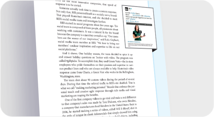 THE POWER OF THE PLATFORM: VISUAL STORYTELLING ON SOCIAL NETWORKS 75 Even for the most innovative companies, that speed of response is to be envied. Someone actually took time to create a custom response. Not only that, REI presented itself as a socially savvy brand. That piqued Ekaterina’s interest, and she decided to meet REI’s social media team and investigate further. REI started its social programs about five years ago. The social team is composed of three people, all passionate about working with customers. It was a natural fit for the brand because the company is a member-owned co-op. “Our mem- bers are the source of our inspiration,” said Lulu Gephart, social media team member at REI. “We love to bring our members’ outdoor inspiration and expertise to life on our social platforms.” And it shows. One holiday season, the team decided to spice it up and answer holiday questions on Twitter with video. The program was called #giftpicks. To accomplish that, they used Green Vests—the in-store employees who pride themselves on their passion and expertise in vari- ous product lines and who are always available to help. Ekaterina’s video response came from Charis, a Green Vest who works in the Bellingham, Washington, store. The team shot about 90 custom videos during the period of several days. During that time the referral traffic to REI’s site doubled. That is what we call “making marketing personal.” Brands that embrace the per- sonal touch and creative agile response through rich media and visual marketing are reaping the benefits. One of the first company videos to go viral and make a real difference to that company’s sales was made by Tom Dickson, who owns Blendtec, a company that manufactures food blenders in the United States. Back in 2006, he started making a series of videos, called Will It Blend?, shot in the style of tongue-in-cheek infomercials that simply showed him using Blendtec food blenders to blend ordinary household objects, including iPhones, credit cards, and golf balls. The videos went viral very quickly,