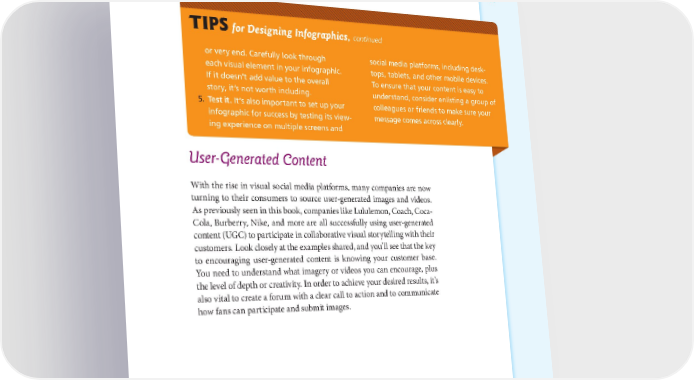 DEVELOPING A VISUAL STORYTELLING ROAD MAP: FROM STRATEGY TO IMPLEMENTATION 167 TIPS for Designing Infographics, continued or very end. Carefully look through social media platforms, including desk- each visual element in your infographic. tops, tablets, and other mobile devices. If it doesn’t add value to the overall To ensure that your content is easy to story, it’s not worth including. understand, consider enlisting a group of 5. Test it. It’s also important to set up your colleagues or friends to make sure your infographic for success by testing its view- message comes across clearly. ing experience on multiple screens and User-Generated Content With the rise in visual social media platforms, many companies are now turning to their consumers to source user-generated images and videos. As previously seen in this book, companies like Lululemon, Coach, Coca- Cola, Burberry, Nike, and more are all successfully using user-generated content (UGC) to participate in collaborative visual storytelling with their customers. Look closely at the examples shared, and you’ll see that the key to encouraging user-generated content is knowing your customer base. You need to understand what imagery or videos you can encourage, plus the level of depth or creativity. In order to achieve your desired results, it’s also vital to create a forum with a clear call to action and to communicate how fans can participate and submit images.