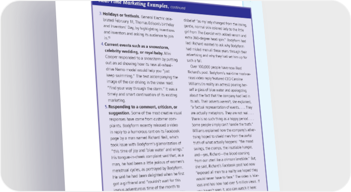 REAL-TIME MARKETING IN A VISUAL WORLD 189 Real-Time Marketing Examples, continued 3. Holidays or festivals. General Electric cele- disbelief “as my lady changed from the loving, brated February 11, Thomas Edison’s birthday gentle, normal skin colored lady to the little and Inventors’ Day, by highlighting inventions girl from The Exorcist with added venom and and inventors and asking its audience to join extra 360-degree head spin.” Bodyform had 15 in. lied! Richard wanted to ask why Bodyform 4. Current events such as a snowstorm, had misled men all these years through their celebrity wedding, or royal baby. Mini advertising and why they had set him up for Cooper responded to a snowstorm by putting such a fall. out an ad showing how its new all-wheel- Over 100,000 people have now liked drive Nemo model would help you “just Richard’s post. Bodyform’s real-time mock-se- keep swimming.” The text accompanying the rious video reply featured CEO Caroline image of the car driving in the snow read: Williams (in reality an actress) pouring her- “Find your way through the storm.” It was a self a glass of blue water and apologizing timely and smart continuation of its existing about the fact that the company had lied in marketing. its ads. Their adverts weren’t, she explained, 5. Responding to a comment, criticism, or “a factual representation of events. . . . They suggestion. Some of the most creative visual are actually metaphors. They are not real. . . . responses have come from customer com- There is no such thing as a happy period. . . . plaints. Bodyform recently released a video Some people simply can’t handle the truth.” in reply to a humorous rant on its Facebook Williams explained how the company’s adver- page by a man named Richard Neill, which tising hoped to shield men from the awful took issue with Bodyform’s glamorization of truth of what actually happens: “the mood “this time of joy and ‘blue water’ and wings.” swings, the cramps, the insatiable hunger, His tongue-in-cheek complaint said that, as a and—yes, Richard—the blood coursing man, he had been a little jealous of women’s from our uteri like a crimson landslide.” But, menstrual cycles, as portrayed by Bodyform. she said, Richard’s Facebook post had now He said he had been delighted when he first “exposed all men to a reality we hoped they got a girlfriend and “couldn’t wait for this would never have to face.” The video is hilar- joyous adventurous time of the month to ious and has now had over 5 million views. If happen,” but his anticipation soon turned to you haven’t seen it, you can watch it here: (continued)