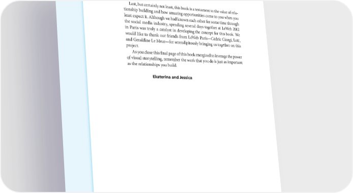 200 ACKNOWLEDGMENTS Last, but certainly not least, this book is a testament to the value of rela- tionship building and how amazing opportunities come to you when you least expect it. Although we had known each other for some time through the social media industry, spending several days together at LeWeb 2012 in Paris was truly a catalyst in developing the concept for this book. We would like to thank our friends from LeWeb Paris—Cédric Giorgi, Loïc, and Geraldine Le Meur—for serendipitously bringing us together on this project. As you close this final page of this book energized to leverage the power of visual storytelling, remember the work that you do is just as important as the relationships you build. Ekaterina and Jessica