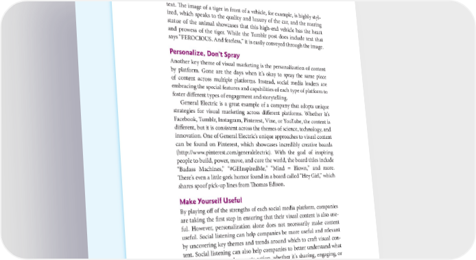 48 THE POWER OF VISUAL STORYTELLING text. The image of a tiger in front of a vehicle, for example, is highly styl- ized, which speaks to the quality and luxury of the car, and the roaring statue of the animal showcases that this high-end vehicle has the heart and prowess of the tiger. While the Tumblr post does include text that says “FEROCIOUS. And fearless,” it is easily conveyed through the image. Personalize, Dont Spray Another key theme of visual marketing is the personalization of content by platform. Gone are the days when it’s okay to spray the same piece of content across multiple platforms. Instead, social media leaders are embracing the special features and capabilities of each type of platform to foster different types of engagement and storytelling. General Electric is a great example of a company that adopts unique strategies for visual marketing across different platforms. Whether it’s Facebook, Tumblr, Instagram, Pinterest, Vine, or YouTube, the content is different, but it is consistent across the themes of science, technology, and innovation. One of General Electric’s unique approaches to visual content can be found on Pinterest, which showcases incredibly creative boards (http://www.pinterest.com/generalelectric). With the goal of inspiring people to build, power, move, and cure the world, the board titles include “Badass Machines,” “#GEInspiredMe,” “Mind = Blown,” and more. There’s even a little geek humor found in a board called “Hey Girl,” which shares spoof pick-up lines from Thomas Edison. Make Yourself Useful By playing off of the strengths of each social media platform, companies are taking the first step in ensuring that their visual content is also use- ful. However, personalization alone does not necessarily make content useful. Social listening can help companies be more useful and relevant by uncovering key themes and trends around which to craft visual con- tent. Social listening can also help companies to better understand what drives consumers and prompts action, whether it’s sharing, engaging, or purchasing.