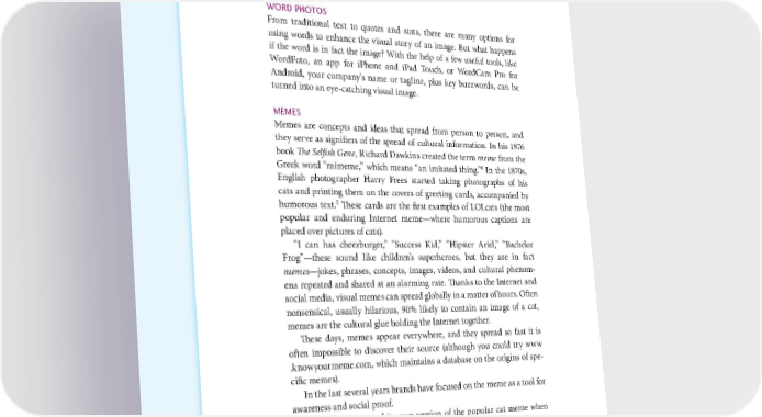 28 THE POWER OF VISUAL STORYTELLING WORD PHOTOS From traditional text to quotes and stats, there are many options for using words to enhance the visual story of an image. But what happens if the word is in fact the image? With the help of a few useful tools, like WordFoto, an app for iPhone and iPad Touch, or WordCam Pro for Android, your company’s name or tagline, plus key buzzwords, can be turned into an eye-catching visual image. MEMES Memes are concepts and ideas that spread from person to person, and they serve as signifiers of the spread of cultural information. In his 1976 book The Selfish Gene, Richard Dawkins created the term meme from the 4 Greek word “mimeme,” which means “an imitated thing.” In the 1870s, English photographer Harry Frees started taking photographs of his cats and printing them on the covers of greeting cards, accompanied by humorous text.5 These cards are the first examples of LOLcats (the most popular and enduring Internet meme—where humorous captions are placed over pictures of cats). “I can has cheezburger,” “Success Kid,” “Hipster Ariel,” “Bachelor Frog”—these sound like children’s superheroes, but they are in fact memes—jokes, phrases, concepts, images, videos, and cultural phenom- ena repeated and shared at an alarming rate. Thanks to the Internet and social media, visual memes can spread globally in a matter of hours. Often nonsensical, usually hilarious, 90% likely to contain an image of a cat, memes are the cultural glue holding the Internet together. These days, memes appear everywhere, and they spread so fast it is often impossible to discover their source (although you could try www .knowyourmeme.com, which maintains a database on the origins of spe- cific memes). In the last several years brands have focused on the meme as a tool for awareness and social proof. Home Depot created its own version of the popular cat meme when it launched “Richard the Cat, a.k.a. Pundit of People,” in spring 2013.