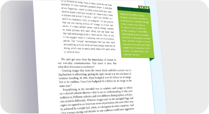 THE RISE OF VISUAL STORYTELLING 17 jump forward to today. Holy smokes, what do we have available? It’s like mankind’s greatest dream is available at our fingertips. I want to share a story with you, and I Research from Billion Dollar want to share it with you visually: all I have to do is take Graphics has shown that 46.1% a picture and e-mail it to you. I put it on Twitter, or I of people say a website’s design post it on Facebook, Flickr, or Instagram. It’s no surprise is the number one criterion that we are sharing billions of images on those net- for discerning the credibility works. It makes perfect sense—we’ve always wanted 19 while MDG of the company, to share pictures with each other, but we never had Advertising has demonstrated the right technology to do it. Now we do. That, to me, that 67% of consumers consider is the biggest trend in marketing and communication, clear, detailed images to be very period. The “simple” technologies that we now have important and carry even more are enabling us to do what we have always dreamed of weight than the product infor- doing, which was to easily share ideas with each other mation, full description, and in pictorial form. customer ratings.20 We can’t get away from the importance of visuals in our everyday communication. That much is clear. But what does this mean to marketers? Creating images that make the viewer think and feel a certain way is big business to advertising: getting the right visuals is at the very heart of business branding. In 2001, Pepsi budgeted over $1 billion on its image. Not to be outdone, Coca-Cola budgeted $1.4 billion for its image in the same year.21 Empathizing in the intended way to symbols and images is reliant on a shared cultural identity—that is, on an understanding of who your audience is. Different cultures, and even different demographics, will pro- cess symbols differently. Whereas images such as star-spangled flags and eagles can appeal to an American sense of patriotism, the same effect may be achieved by a maple leaf, a lion, or a kangaroo in other countries. And what appears strong and decisive to one audience could seem aggressive to another.
