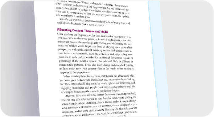 DEVELOPING A VISUAL STORYTELLING ROAD MAP: FROM STRATEGY TO IMPLEMENTATION 143 this simple exercise, you’ll better understand the shelf life of your content, which can help in determining the frequency per day and the time of day your content should be posted. You will also learn how to not step on your own toes by overposting so that you can give your content the optimal amount of time it needs to shine. Usually the shelf life of a tweet is considered to be an hour at most, and shelf life of a Facebook post is about 24 hours. Allocating Content Themes and Media Once you have the frequency set, it’s time to determine your monthly con- tent mix. This is where you prioritize by social media platform the most important content themes that go into crafting your visual story. The mix needs to balance what’s important from an ongoing visual storytelling perspective with goals, current events, questions, and general conversa- tion from your customers. Rank these themes, and assign a frequency qualifier to each bucket, whether it’s in terms of the number of posts or percentage of the month’s content. This mix will likely be different by social media platform. It will also likely change each month depending on how much news your company has or the tweaks you’re making in response to fan engagement. When ranking these items, ensure that the mix has a balance to what you want your customers to know about you, versus what they’re looking for. The content should also aim to be mostly upbeat, fun, motivating, and engaging. Remember that people don’t always come online to read the newspaper. Sometimes they want to pet the cute dog too. Once you have your monthly content themes outlined and prioritized, you can use this information as your baseline when you’re crafting the actual visual content. Outlining content themes makes it easy to identify what messages will best be conveyed as photos, videos, infographics, pre- sentations, and/or some other medium. Planning will also make your life overseeing social media easier: you won’t be scrambling to get post con- tent set or have to articulate your vision for content on the fly.