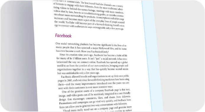 THE POWER OF THE PLATFORM: VISUAL STORYTELLING ON SOCIAL NETWORKS 77 made-for-TV commercials. The best brand YouTube channels use a variety of formats to engage with their followers, from the more traditional adver- tising videos to behind-the-scenes footage, meetings with team members, videos shot by fans, how-to or troubleshooting guides, or minidocumenta- ries about issues surrounding the products. As smartphone and tablet usage increases and becomes more a part of the everyday lives of people around the world, YouTube will become part of a forward-thinking brand’s strat- egy to connect with audiences in ways unimaginable only a few years ago. Facebook One social networking platform has become significant in the lives of so many people that it has spawned a major Hollywood film, and its name has even become a verb. Have you Facebooked lately? Since its creation nine years ago, Facebook has become a habit of life for many of its 1 billion users. It isn’t “just” a social network: it has revo- lutionized the way we connect online. Facebook has opened up a global world to us from the comfort of our own armchairs, bringing people and organizations together in a way that has quickly become second nature but was unthinkable only a few years ago. Facebook allowed brands and organizations to set up their own public pages in 2007, and ever since forward-thinking marketers have been using them—and the many improvements introduced over the years—to con- nect with their customers in ever more inventive ways. One of the greatest assets of a company Facebook page is that text, image, and video posts can all be seamlessly integrated in a user-friendly design that encourages comments, likes, and shares from followers. Promotions and campaigns can go viral very quickly, and feedback from fans can allow you to generate two-way conversations with followers. Visual posts really stand out on a company page and generate more engagement than text posts alone. Facebook is even starting to replace brand websites as a fan’s go-to place to find out more about the company: