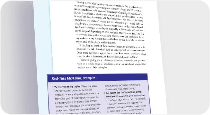 188 THE POWER OF VISUAL STORYTELLING Timing is critical to creating responses in real time. For brands that are more used to organizing campaigns around the print ad and TV commer- cial, planned months in advance, the concept of turning around visuals in days or even hours can be hard to adapt to. But if your brand has a strong sense of the story it wants to tell, there’s no reason why you can’t integrate news items and cultural events that are relevant to your brand and give your brand’s perspective on them through visual media. Not all brands need to turn images around quite as quickly as Oreo; some will have lon- ger to respond depending on their audience and the news item. This fast turnaround means that brands have become more like publishers, think- ing and operating in ways that enable them to give their take on relevant events on a rolling basis, as they happen. It can help to think of these sorts of images as subplots to your main print and TV ads. You don’t have to come up with whole new concepts. Once these have been agreed on, you can have more flexibility to adapt them to what it happening in the world around you in real time. Without giving too much text explanation, companies can give their take on a whole range of situations with a well-developed image. Below are just some of the examples: Real-Time Marketing Examples 1. Twitter trending topics. When the same- glasses next to each other with each one sex marriage bill passed in the United showcasing a trace of red lipstick. Kingdom recently, Virgin Holidays made sure 2. Big events like the Super Bowl or the they were part of the celebrations—and the Olympics. Oreo was the social media winner company got in a timely reminder of their at the Super Bowl with its “You can still dunk 13 The in the dark” tweet—and it continued the honeymoon packages at the same time. image read: “Same sex marriage bill passed. theme at the Oscars, tweeting its own tribute Time for a honeymoon.” The text was accom- to James Bond during a segment honoring 14 panied by the visual of two full champagne the world’s most famous secret agent.