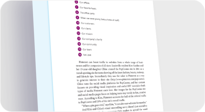 64 THE POWER OF VISUAL STORYTELLING 6 Our offices 7 Our favorite foods 8 The office party 9 When we were young (baby photos of staff) 10 Our customers 11 Our clients 12 Our mission 13 Our company’s charity 14 Our community 15 Our town 16 Fan Love Pinterest can boost traffic to websites from a whole range of busi- nesses and for companies of all sizes. Louisville resident Kim Gordon and her 15-year-old daughter Chloe created the PopCosmo site in 2011 as a trend-spotting site for teens showing off the latest fashion, beauty, makeup, and lifestyle tips. Immediately they saw the value in Pinterest as a way to generate interest in their site (http://www.pinterest.com/popcosmo). Chloe runs the social media platforms for PopCosmo, and her content focuses on providing visual inspiration and useful DIY tutorials—both types of media Pinterest users love. Her images for the PopCosmo site and social media pages focus on helping teens stay trendy in fun, creative ways. According to Kim, Pinterest accounts for half of the referral traffic to PopCosmo and 20% of the site’s overall traffic. “When a pin goes viral,” says Kim, “it can alter our web stats for months.” And Kim and Chloe’s visual storytelling savvy doesn’t just extend to their own Pinboard—they encourage their readers to spread the word about their site through images.
