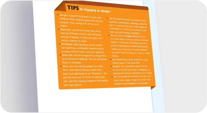 THE POWER OF THE PLATFORM: VISUAL STORYTELLING ON SOCIAL NETWORKS 123 TIPS for Engaging on Google+ • Google+ supports long posts, so you can • Use the Events feature to promote future combine more scholarly posts with shorter, launches, conferences, meetings, presenta- snappier ones, along with photos and tions, or awards that your circles might be videos. interested in. It sends out invitations that • Make the most of the Circles feature by then sync with Google Calendars. sharing different content with different • You can use the Ripples feature to find groups of people, so everyone gets infor- out more about how your posts have been mation relevant to them. shared. If a few key individuals are influ- • Remember that having an active profile ential in sharing your content particularly can boost you up Google’s search engine, widely, you may wish to build a relation- so keep content fresh, and post regularly. ship with them to help your reach on social • Make the most of Hangouts by using them media. as promotional material. You can broadcast • Use relevant key words and links in your them to followers. About page to help drive SEO. • When you are adding people to Circles, • Google+ has a powerful search facility, think hard about how you label them. so use it to add businesses, colleagues, or Don’t just add them all as “followers.” You people with similar interests to your Circles. get the most out of Circles by being spe- • Be sure to add the +1 feature to your com- cific and then sharing targeted information pany’s web page or blog if you want the with each group. content to be shareable onto Google+.