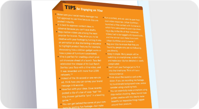 THE POWER OF THE PLATFORM: VISUAL STORYTELLING ON SOCIAL NETWORKS 109 TIPS for Engaging on Vine • Make sure your social media manager has • Run a contest, and ask users to post their full approval to use Vine because clips are own video responses. Urban Outfitters posted instantly. launched a Vine contest with Converse in • It is best to approve content ideas in which fans were asked to post clips show- advance because you can’t save drafts. ing a day in the life of their Converses. • Stop-motion videos are among the most Videos had to be tagged with #yourchucks, popular for brands. They allow you to be and the winner won items from both 141 creative with your footage by turning it into Urban Outfitters and Converse. an animation or else shortening a sequence • Tag your clips to ensure that they are to highlight product features (for example, found by people who are not following showcasing how a kitchen gadget works or you directly. how a piece of furniture is assembled). • Keep it simple. Many people will be • Vine is perfect for creating a short prod- watching on smartphones, so don’t try uct showcase ahead of a launch. Taco Bell and make your clip too detailed or overly celebrated the release of its Cool Ranch complicated. Doritos Loco Taco with a Vine video, and • Don’t rush your footage just to fit it it was rewarded with more than 2,500 into the timeframe. Think of it as a 139 minicommercial. retweets. • Instead of the 30-second or one-minute • Think about the sound as well as the ad, think how you can convey your brand vision. If you are recording live footage, message in 6 seconds. try to eliminate background noise, and/or • Have fun with your ideas. Dove recently consider using a backing track. posted a clip of a bar of soap “ball” hit- • You can essentially make animations using ting shower gel bottle “pins” in a bowling stop-motion shooting. Many brands have 140 game. gotten creative with this idea to make • You can get behind the scenes at your com- beautiful or impossible things happen pany by posting fun footage—but make around their products. sure that everyone is aware of the filming before you start.