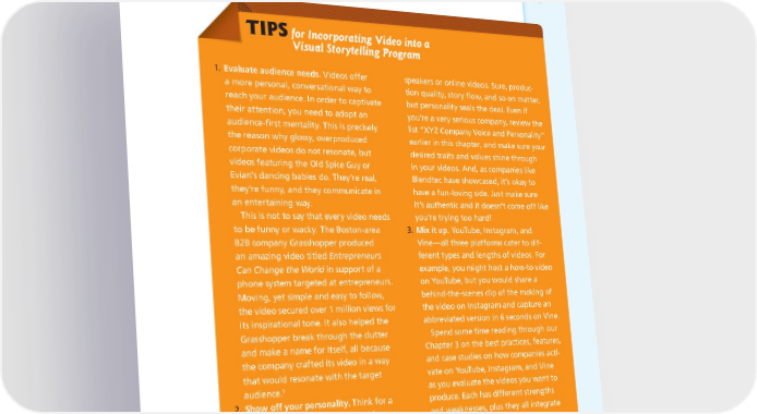 DEVELOPING A VISUAL STORYTELLING ROAD MAP: FROM STRATEGY TO IMPLEMENTATION 173 TIPS for Incorporating Video into a Visual Storytelling Program 1. Evaluate audience needs. Videos offer speakers or online videos. Sure, produc- a more personal, conversational way to tion quality, story flow, and so on matter, reach your audience. In order to captivate but personality seals the deal. Even if their attention, you need to adopt an you’re a very serious company, review the audience-first mentality. This is precisely list “XYZ Company Voice and Personality” the reason why glossy, overproduced earlier in this chapter, and make sure your corporate videos do not resonate, but desired traits and values shine through videos featuring the Old Spice Guy or in your videos. And, as companies like Evian’s dancing babies do. They’re real, Blendtec have showcased, it’s okay to they’re funny, and they communicate in have a fun-loving side. Just make sure an entertaining way. it’s authentic and it doesn’t come off like This is not to say that every video needs you’re trying too hard! to be funny or wacky. The Boston-area 3. Mix it up. YouTube, Instagram, and B2B company Grasshopper produced Vine—all three platforms cater to dif- an amazing video titled Entrepreneurs ferent types and lengths of videos. For Can Change the World in support of a example, you might host a how-to video phone system targeted at entrepreneurs. on YouTube, but you would share a Moving, yet simple and easy to follow, behind-the-scenes clip of the making of the video secured over 1 million views for the video on Instagram and capture an its inspirational tone. It also helped the abbreviated version in 6 seconds on Vine. Grasshopper break through the clutter Spend some time reading through our and make a name for itself, all because Chapter 3 on the best practices, features, the company crafted its video in a way and case studies on how companies acti- that would resonate with the target vate on YouTube, Instagram, and Vine audience.5 as you evaluate the videos you want to 2. Show off your personality. Think for a produce. Each has different strengths moment about your favorite conference and weaknesses, plus they all integrate (continued)