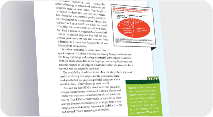 REAL-TIME MARKETING IN A VISUAL WORLD 185 Successful marketing uses cutting-edge social technology to understand customers and anticipate need as never before. You bought a particular product? Here are two more sugges- tions based on your personal profile, tailored to your buying habits and network or friends. You are interested in an event? Here is how our brand is leading the conversation around that event. You have a comment, suggestion, or complaint? This is the creative response that will not only answer your query but will also turn you from a detractor to a committed fan, eager to tell your friends about our company. Real-time marketing is about more than a quick response. It is about creativity and driving dialogue, and about peo- ple doing real things and having meaningful conversations in real time. With so much social data at our fingertips, marketing departments can not only respond to the zeitgeist in real time but they can also drive it in a way that was unimaginable until now. The availability of reliable, timely data has always been key to suc- cessful marketing campaigns, and the explosion of social media in the last five years has provided companies with a wealth of data—if they choose to make use of it. You can see how RTM is about more than just adver- Over half (53%) of brands sur- tising or smart content creation—it is about a relevant and veyed were planning to make timely two-way conversation between a brand and its cus- greater use of real-time data, tomers. True RTM mentality needs to permeate all of the with only 17% of brands say- relevant internal stakeholders and strategies from a com- ing they either didn’t plan on pany’s creative to its social responses, to traditional media using it, didn’t know how to, and beyond. This is marketing at its very best. or couldn’t afford to. First-time users numbered 11%, a sizable 9 adoption figure.
