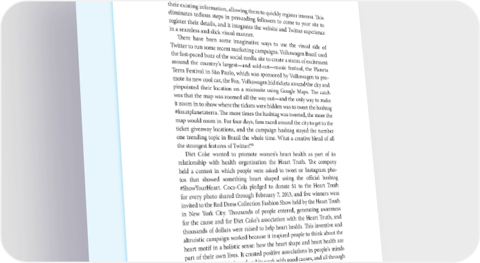 88 THE POWER OF VISUAL STORYTELLING their existing information, allowing them to quickly register interest. This eliminates tedious steps in persuading followers to come to your site to register their details, and it integrates the website and Twitter experience in a seamless and slick visual manner. There have been some imaginative ways to use the visual side of Twitter to run some recent marketing campaigns. Volkswagen Brazil used the fast-paced buzz of the social media site to create a storm of excitement around the country’s largest—and sold-out—music festival, the Planeta Terra Festival in São Paulo, which was sponsored by Volkswagen to pro- mote its new cool car, the Fox. Volkswagen hid tickets around the city and pinpointed their location on a microsite using Google Maps. The catch was that the map was zoomed all the way out—and the only way to make it zoom in to show where the tickets were hidden was to tweet the hashtag #foxatplanetaterra. The more times the hashtag was tweeted, the more the map would zoom in. For four days, fans raced around the city to get to the ticket giveaway locations, and the campaign hashtag stayed the number one trending topic in Brazil the whole time. What a creative blend of all 88 the strongest features of Twitter! Diet Coke wanted to promote women’s heart health as part of its relationship with health organization the Heart Truth. The company held a contest in which people were asked to tweet or Instagram pho- tos that showed something heart shaped using the official hashtag #ShowYourHeart. Coca-Cola pledged to donate $1 to the Heart Truth for every photo shared through February 7, 2013, and five winners were invited to the Red Dress Collection Fashion Show held by the Heart Truth in New York City. Thousands of people entered, generating awareness for the cause and for Diet Coke’s association with the Heart Truth, and thousands of dollars were raised to help heart health. This inventive and altruistic campaign worked because it inspired people to think about the heart motif in a holistic sense: how the heart shape and heart health are part of their own lives. It created positive associations in people’s minds about the Coca-Cola brand and its work with good causes, and all through a simple visual message.89