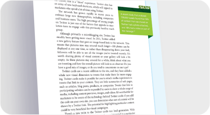 THE POWER OF THE PLATFORM: VISUAL STORYTELLING ON SOCIAL NETWORKS 87 the clutter; this is a “clean” experience. Twitter also has an array of new keyboard shortcuts, which will appeal to marketers who spend a lot of time using Twitter. A recent study that analyzed The network has grown rapidly in recent years to 739,000 tweets found that 76% embrace large new demographics, including companies of content that was shared on and business users. The high percentage of young people Twitter had a photo attached, on Twitter is just one of the factors that appeals to mar- and 18% had a video as part of keters keen to engage with this previously hard to reach the message.87 group. Although primarily a microblogging site, Twitter has steadily been getting more visual. In 2011, Twitter added a new gallery feature that gave an image-based look to the network. This means that pictures now stay around much longer—100 photos can be displayed at any one time, so rather than disappearing down your feed, followers will be able to see all the images you’ve tweeted recently. It’s worth sharing plenty of visual content or your gallery will look a bit empty. As these pictures stay around for a while, think about what you are tweeting and how the overall picture will look to an observer: Do you have a good mix of images, or do you tend to concentrate on one type? Twitter cards are a recent addition to the site, and they have added a whole new visual dimension to tweets that make them far more engag- ing. Twitter cards make it possible for you to attach media experiences to tweets that link to your content. They are little summaries of web pages, such as articles, blog posts, products, or companies. Tweets that link to participating websites can be expanded by users to show a whole range of media, including content previews, images, and videos. It’s worthwhile for marketers to be aware of the technology behind Twitter cards: if you add the code on your own site, you can determine what sort of content will be shown by a Twitter link. The potential for highlighting particular content could be very beneficial for visual campaigns. There’s a new twist to the Twitter cards too: lead generation. With this simple but brilliantly interactive tool, users interested in a particular offer or promotion will be able to fill out a field on the card that links to